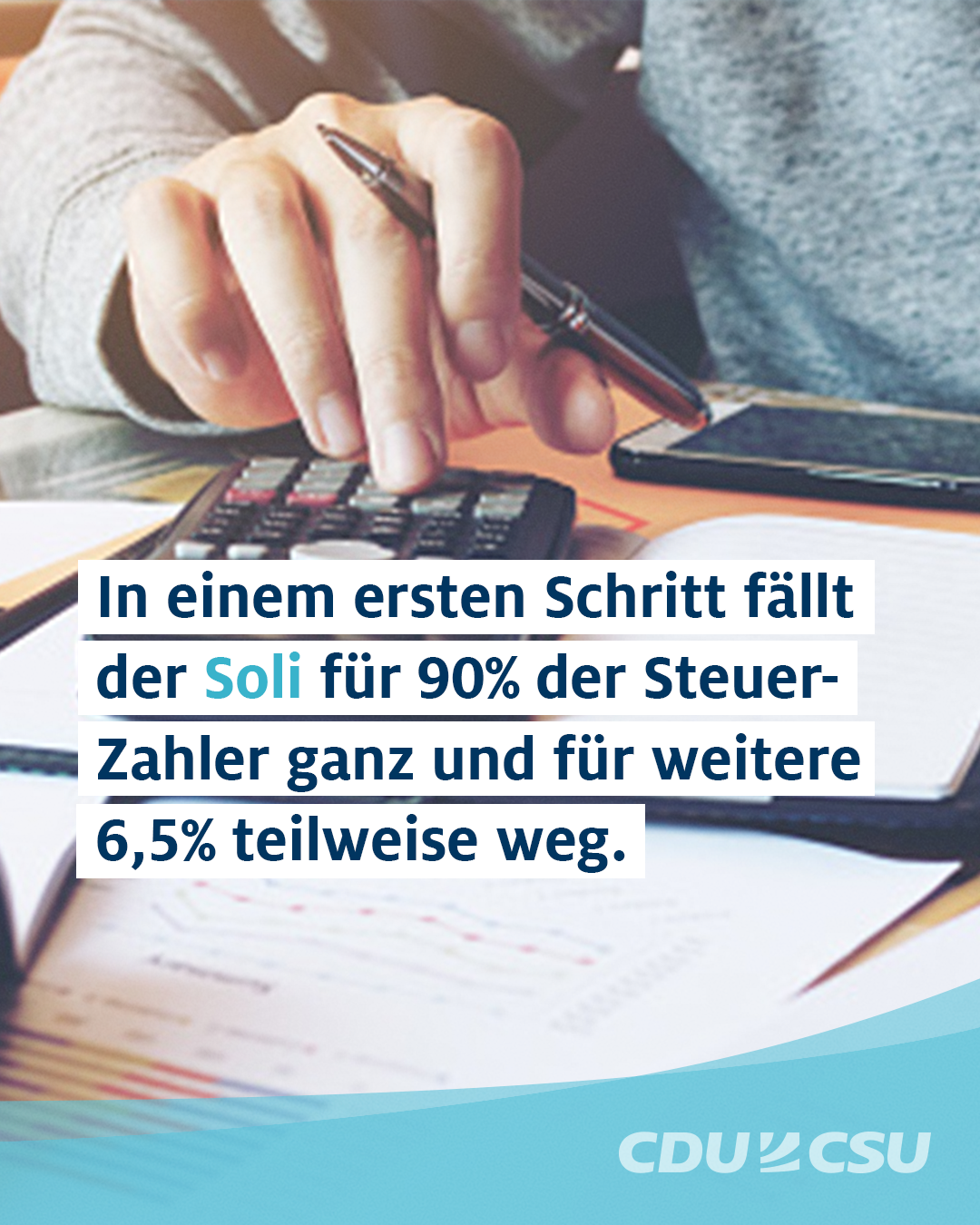 Wie im Koalitionsvertrag angekündigt, wird der 1995 eingeführte Solidaritätszuschlag in einem ersten Schritt für fast alle Steuerzahler abgeschafft. Dies ist mit einem jährlichen Finanzvolumen von mehr als 10 Milliarden Euro die größte finanzielle Einzelmaßnahme aus dem Koalitionsvertrag. „Auch wenn wir als CDU/CSU-Bundestagsfraktion weiter das Ziel verfolgen, den Soli ganz abzuschaffen, ist die aktuelle Entlastung ein großer Fortschritt für fast alle Steuerzahler“, so Krings.