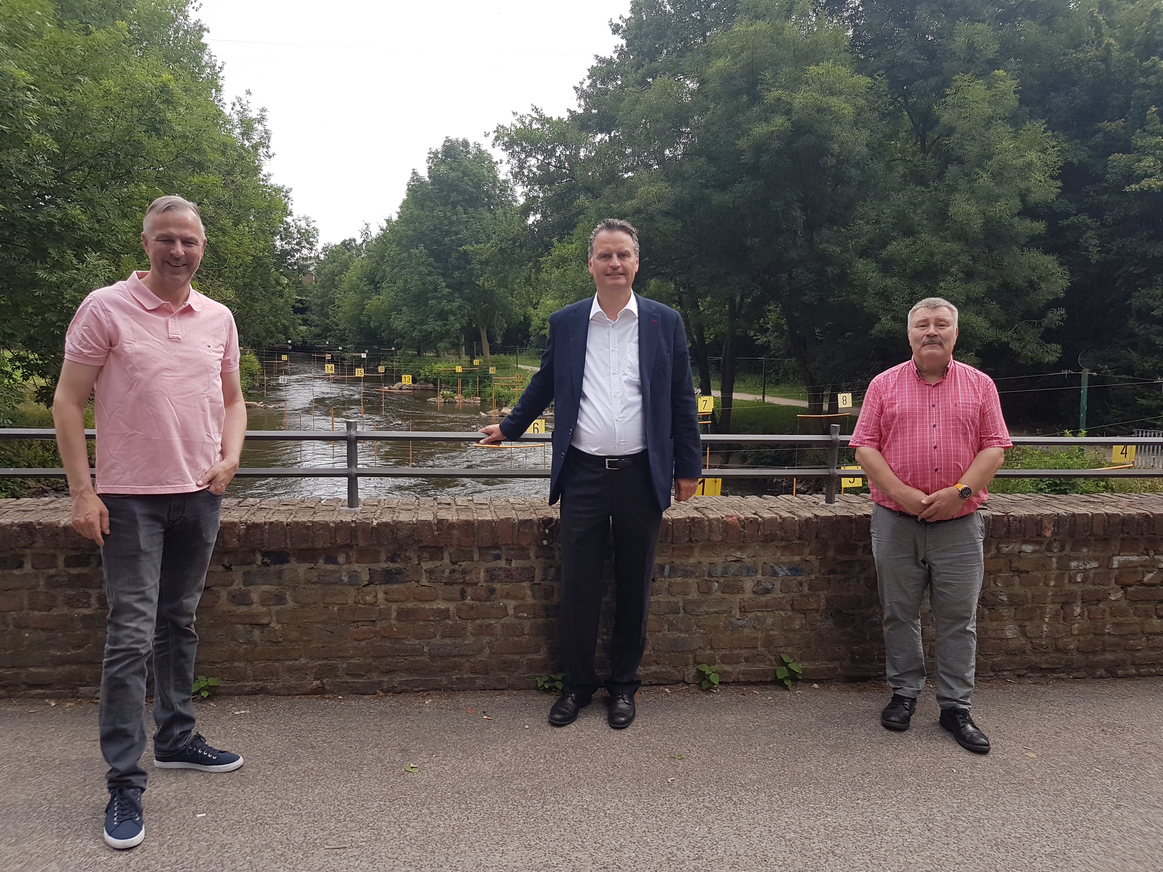 ...mit Vertretern des Kreises Neuss im Gutshof Gnadenthal in Neuss. Hinter dem Gutshof entlang fließt die Erft, auf der sich genau an diesem Abschnitt eine Kanuslalomstrecke von 230m befindet. Herr Dirk Brügge, Kreisdirektor Rhein-Kreis Neuss und Herr Heiner Cöllen, stv Fraktionsvorsitzender der CDU Fraktion Rhein-Kreis Neuss, wiesen mich daraufhin, dass diese Slalomstrecke durch den Kohleaustieg wegfallen wird, da der Eft dann kein sogenanntes Sümpfungswasser mehr zugefügt wird und die Erft zurückgehen bzw renaturiert wird. Herr Brügge und Herr Cöllen haben mir das Sportprojekt Wildwasserpark Dormagen für eine neue Strecke vorgestellt. Das Projekt hat eine überregionale Bedeutung, könnte Bundesleistungsstützpunkt werden und auch Bestandteil der Olympiawerbung Rhein-Rhur.