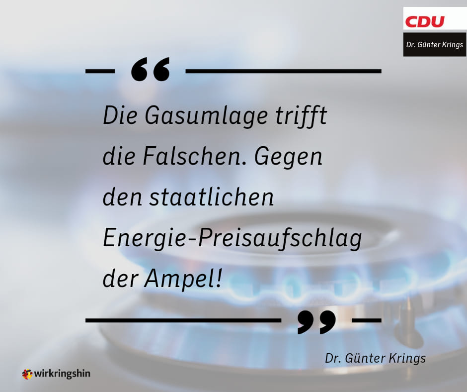 Mit unserem heutigen Antrag im Bundestag haben wir deutlich gemacht: Die handwerklich fehlerhafte und sozial ungerechte Gasumlage muss abgeschafft werden. Basierend auf einer undurchsichtigen Berechnungsgrundlage hat die Bundesregierung eine Abgabe eingeführt, die auch Unternehmen zu Gute kommt, die gar keine Unterstützung bräuchten, gleichzeitig aber Menschen mit kleinen und mittleren Einkommen sowie den Mittelstand durch die Umlage und die darauf erhobene Mehrwertsteuer zusätzlich belastet. Kein anderes Land in Europa antwortet auf die rapide steigenden Gaspreise noch mit einer zusätzlichen staatlichen Zwangsbelastung. Die Ampel-Regierung ist hier auf dem falschen Weg. Auch gibt es keine Antworten auf Fragen nach dem Umgang mit Festverträgen, Fernwärme-Bezug, zu erwartende Zahlungsausfälle und Insolvenzen von Stadtwerken, wodurch die Grundversorgung in Gefahr geraten könnte. Als CDU/CSU setzen wir alles daran, dass die aktuell gültige Rechtsverordnung aufgehoben wird.