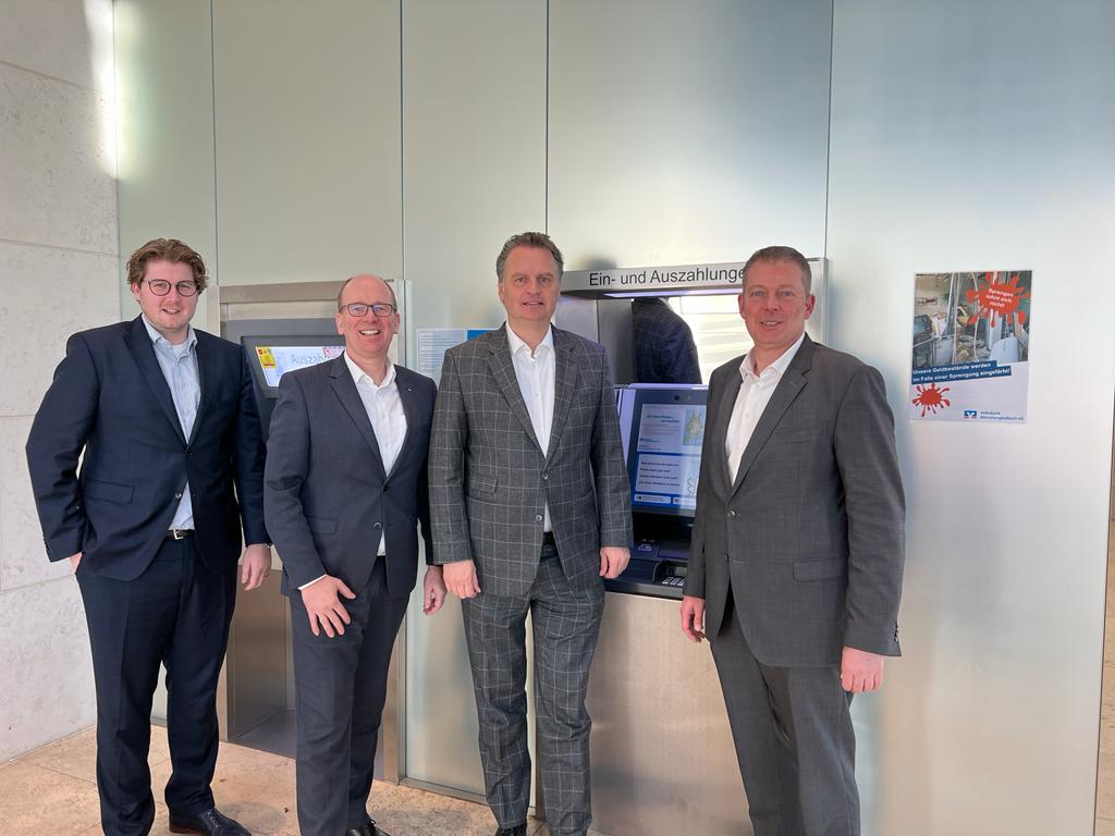 Die Zahl der gesprengten Geldautomaten hat in der Grenzregion eine Besorgnis erregende Höhe angenommen. Alleine die Volksbank Mönchengladbach war in den letzten 12 Monaten sechs Mal betroffen. Der Mönchengladbacher Bundestagsabgeordnete Dr. Günter Krings (CDU) traf den Vorstand des Kreditinstituts zu einem Informationsgespräch zu diesem Thema. Die Vorstände Franz Meurers und Carsten Thören sowie der Sicherheitsbeauftragte Jörg Greven schilderten die Vorgehensweise der Täter, die in den Niederlanden die Sprengung von Geldautomaten regelrecht trainieren und immer größere Sprengladungen nutzen, um dann mit ihrer Beute Richtung Niederlande wieder zu verschwinden.
