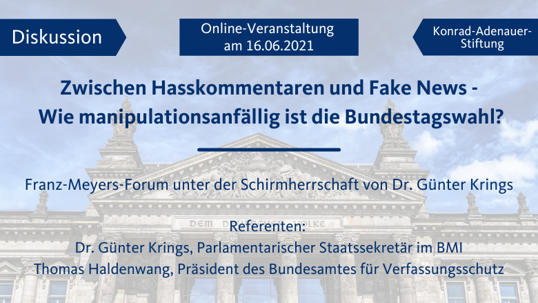 Unter der Schirmherrschaft des Mönchengladbacher Bundestagsabgeordneten Dr. Günter Krings lädt die Konrad-Adenauer-Stiftung alle interessierten Bürgerinnen und Bürger zu einer digitalen Ausgabe des Franz-Meyers-Forum ein. Am Mittwoch, dem 16. Juni 2021, ist von 18.00 Uhr bis 19.30 Uhr mit Thomas Haldenwang der Präsident des Bundesamtes für Verfassungsschutz zu Gast und wird unter dem Titel „Zwischen Hasskommentaren und Fake News – Wie manipulationsanfällig ist die Bundestagswahl?“ referieren. Das Franz-Meyers-Forum findet dabei zum ersten Mal als Video-Konferenz statt.